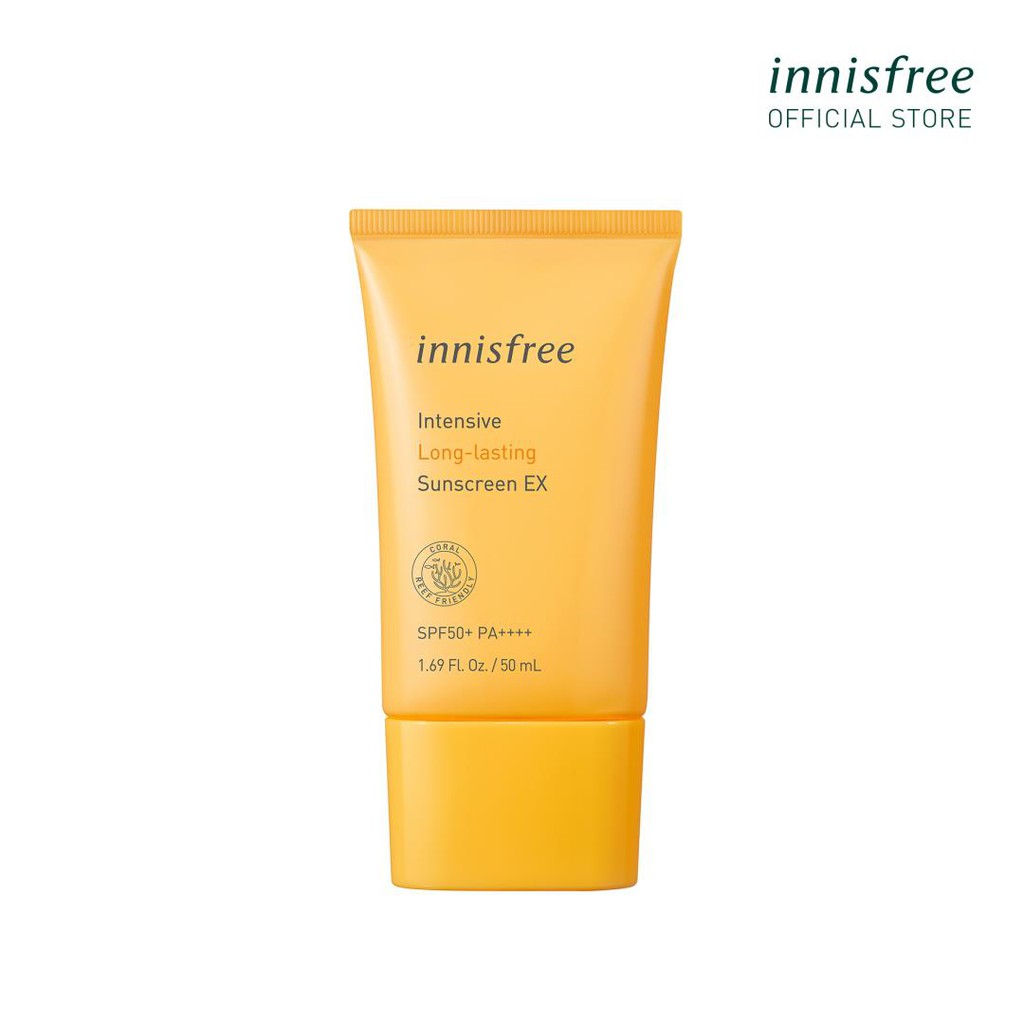 Kem chống nắng lâu trôi innisfree Intensive Long Lasting Sunscreen SPF50+ PA++++ 50ml chiết xuất từ rau má và trà xanh, có khả năng chống nước, giúp nuôi dưỡng và bảo vệ da tốt hơn khỏi tia UV, phù hợp cho da dầu và da hỗn hợp.